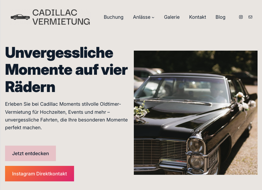 Responsive, mehrseitige Webseite mit Fahrzeuggalerie, aktuellen Blogposts, Online-Buchungsanfrage und Kontaktformular. Stilvolles Design passend zum klassischen Image.